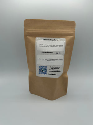 Turkey, oat flour, pureed sweet potato, egg, coconut oil, salmon oil,